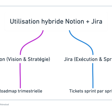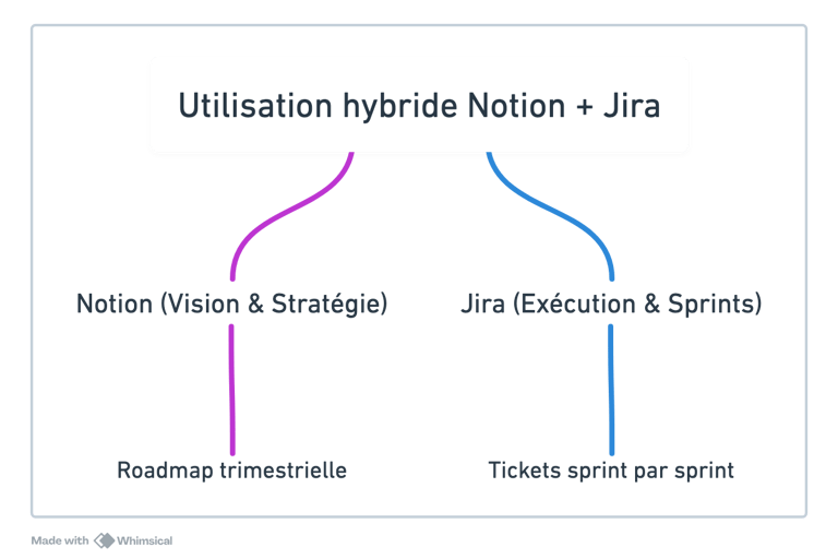 Je maintiens la vision dans Notion (roadmap, OKR, contexte) et j'exécute dans Jira (sprints, tickets, suivi quotidien).